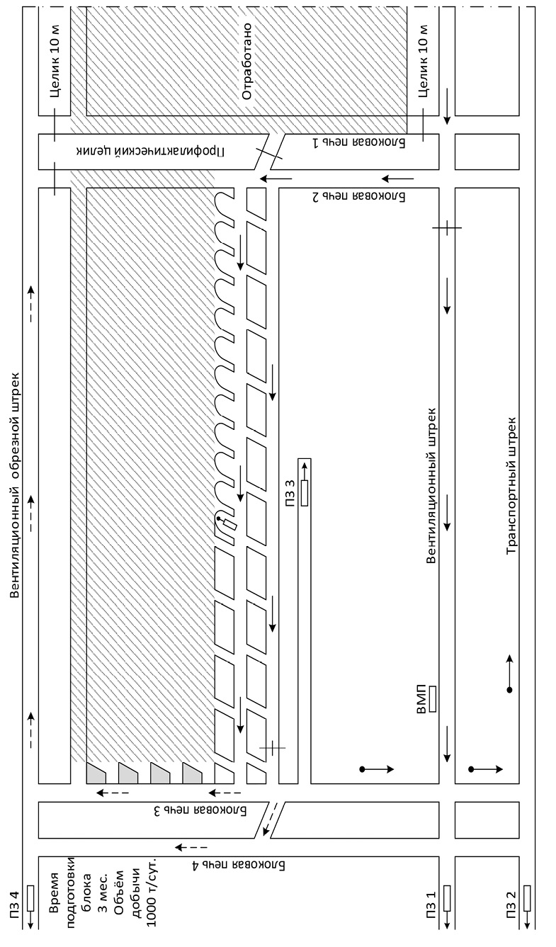 В зависимости от гипсометрии и мощности пласта блок может оконтуриваться сверху и снизу штреками, а по простиранию проводятся блоковые печи, от которых проводятся прямым ходом камеры, обратным ходом междукамерные целики частично отрабатываются заходками (ПЗ – часть угольного массива, вынимаемая в забое за один полный технологический цикл). В одновременной работе находятся четыре проходческих комбайна (рис. 3, ПЗ 1, ПЗ 2, ПЗ 3, ПЗ 4). Плановая добыча угля составляет до 1000 т в сутки. Транспортировка горной массы от комбайнов до конвейера на транспортном штреке осуществляется самоходными вагонами.