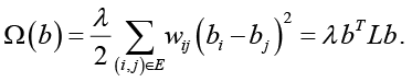 Эти коэффициенты b ∊ Rm представляют оценочные вклады каждой фразы в отклик. На малых выборках PLS обладает преимуществом перед обычной регрессией и даже RIDGE/LASSO, избегая проблемы мультиколлинеарности. За счёт ограничения пространства несколькими компонентами d ≪ m метод устойчиво оценивает влияния даже при m ≫ N. Однако без дополнительной регуляризации PLS-модель будет выбирать из группы коррелированных фраз одну произвольную, присваивая другим нулевые коэффициенты. Для текстовых данных это означает, что синонимичные или схожие по смыслу выражения могут получить сильно различающиеся оценки bi. Чтобы учесть априорные связи между текстовыми признаками, в модель вводится графовая регуляризация. Составляется ненаправленный граф семантической близости G = (V,E), где вершины V соответствуют уникальным фразам. Ребро (i,j) ∊ E проводится между двумя фразами, если они близки по смыслу. Для количественной оценки семантической близости используется косинусное сходство между векторными представлениями фраз. Если ei – эмбеддинг фразы i, то вес ребра задаётся как wj при превышении заданного порога. Полученный взвешенный граф отражает структуры синонимичных и тематически связанных выражений в корпусе. Регуляризация по графу вводится в функционал оптимизации модели в виде штрафа на разрыв значений коэффициентов соседних вершин. Для вектора регрессионных коэффициентов b добавляется пенальти вида формула (1):