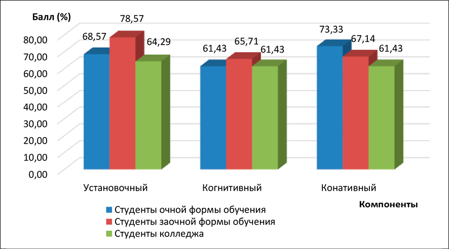 Исследуя сформированность когнитивного компонента у разных групп студентов, авторы выявили, что осведомленность о профессии ожидаемо увеличивается в процессе обучения у студентов очной формы обучения и остается практически неизменной у студентов-заочников. У студентов колледжа график изменения осведомленности показывает, что высокие результаты, демонстрируемые на первом курсе, значимо (по t-критерию Стьюдента) снижаются к середине обучения и увеличиваются только на старших курсах, что свидетельствует о недостаточно продуктивной работе в данном направлении.