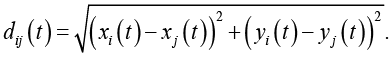 Для каждого обнаруженного объекта на протяжении его движения по кадрам формируется пространственно-временная траектория. Анализ взаимного положения пар объектов позволяет идентифицировать потенциальные конфликтные ситуации. При этом для двух объектов i и j, движущихся по координатам (xi(t),yi(t)) и (xj(t),yj(t)), евклидово расстояние между ними определяется выражением: