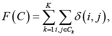 где C={C1,C2,…,CK} – разбиение выборки на K кластеров, а δ(i,j) – мера близости объектов внутри одного кластера.