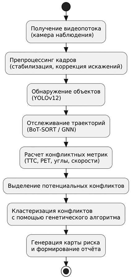 В качестве исходных данных использовались видеозаписи транспортного потока с уличных камер наблюдения, установленных на участках с плотным городским движением. Видеопоток анализировался с целью автоматического выявления потенциальных конфликтных взаимодействий участников дорожного движения, оценки их параметров и последующей стратификации по уровню риска. Общая структура предлагаемой системы обработки представлена на рисунке 1.