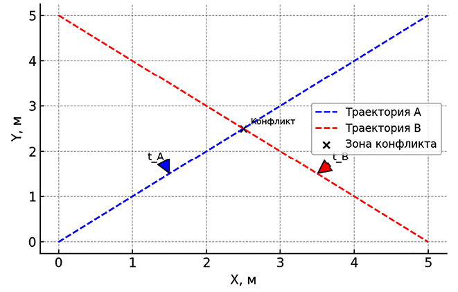PET характеризует временной зазор между двумя участниками движения при последовательном прохождении пересекающихся траекторий, что особенно актуально для оценки конфликтов с участием уязвимых участников (например, пешеходов и велосипедистов). Геометрическая интерпретация конфликта с расчётом PET приведена на рисунке 2, где схематически показаны пересекающиеся траектории, момент пересечения и соответствующие временные метки. Такая визуализация позволяет наглядно представить, как извлекается информация из траекторных данных.