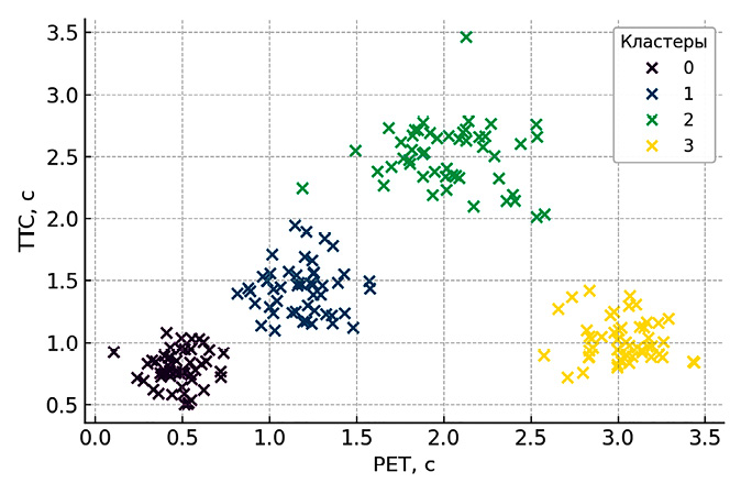 Применение генетического алгоритма кластеризации позволило разделить все ситуации на четыре устойчивые группы по признакам риска. Наиболее опасный кластер включал 184 конфликта с медианными значениями TTC = 0.94 C и PET = 0.31 c. По сравнению с алгоритмом k-средних, предложенный подход обеспечил прирост индекса силуэта с 0.42 до 0.61 и снижение внутрикластерной дисперсии на 27,8%, что свидетельствует о более качественном разделении событий. Индекс силуэта – безразмерная метрика [−1;1], показывающая, насколько объект ближе к своему кластеру, чем к соседнему; внутрикластерная дисперсия – среднее квадратичное отклонение точек от центров своих кластеров. Пример результатов кластеризации представлен на рисунке 3, где каждая точка отображает одно конфликтное взаимодействие, а цвет обозначает принадлежность к кластеру. Кластеры, агрегирующие события с малыми значениями TTC и PET, отражают более высокий уровень риска, поскольку характеризуются быстрым сближением и минимальными временными зазорами при пересечении траекторий.