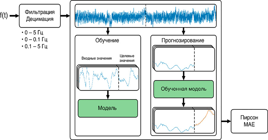 На рис. 1 представлена схема обучения моделей. Прогнозирование выполнялось для трендовой составляющей (область до 0,1 Гц), области НЧК (от 0,1 до 5 Гц) и диапазона до 5 Гц.