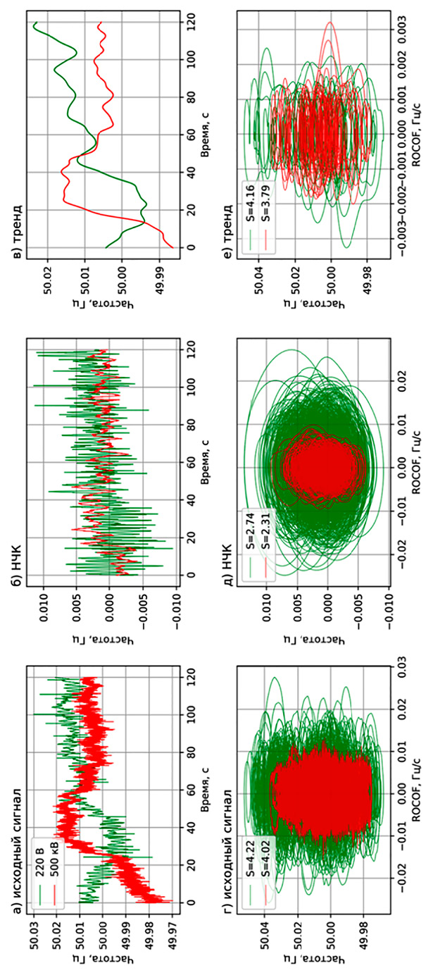 На рис. 2 представлены сигналы линии 500 кВ (красный цвет) и сети 220 В (зеленый цвет) в различных частотных областях. В первой колонке приведены исходные сигналы, во второй – сигналы в области НЧК, в последней колонке – трендовая составляющая. В первой строке показаны сигналы во времени, во второй – их фазовые портреты. На оси ординат фазовой плоскости отложена частота, на оси абсцисс – ее производная, обозначаемая как ROCOF.