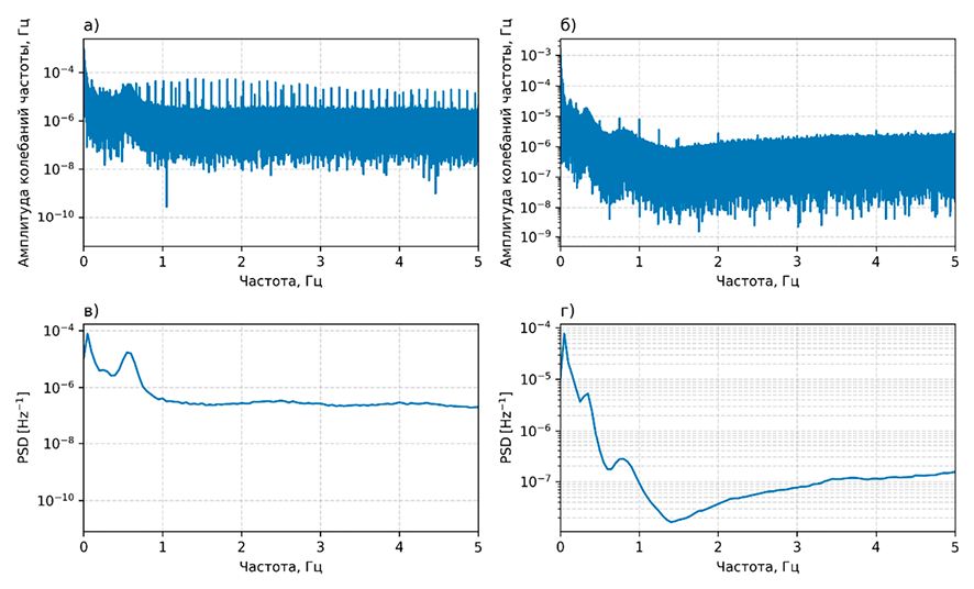 В спектре (рис. 4, а) наблюдается выраженная гребенчатая структура, соответствующая кратным гармоническим составляющим. Спектр (рис. 4, б) характеризуется преобладанием низкочастотных составляющих: амплитуда спектра убывает в диапазоне до 1,5 Гц, тогда как на более высоких частотах амплитуда остается на низком уровне. Основная энергия сигналов сосредоточена в диапазоне до 1 Гц.