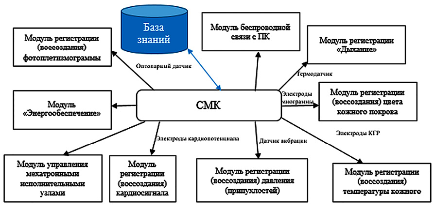 В состав комплекса входят компоненты регистрации физиологических параметров человека [5], модуль для организации беспроводной связи, модуль управления мехатронными исполнительными устройствами, а также система энергообеспечения. Обобщенная структурная схема системы на рис. 3.