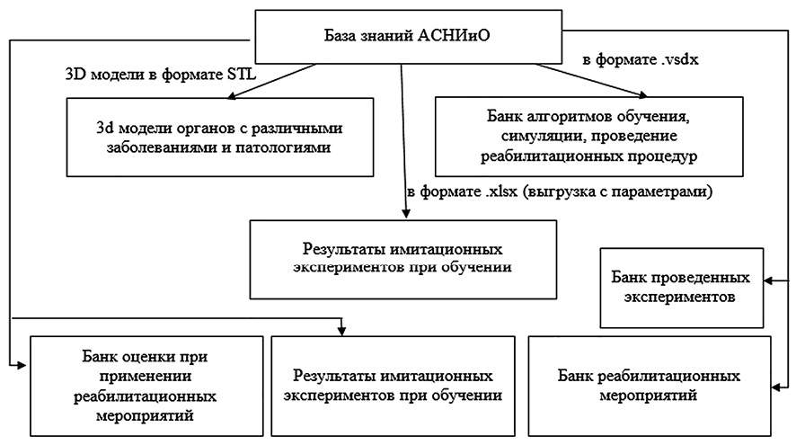 База знаний в предлагаемом медицинском комплексе наполнена 3D-моделями органов с различными заболеваниями и патологиями, также в ней содержится банк алгоритмов для обучения, симуляции, проведения реабилитационных процедур, результаты имитационных экспериментов. Все перечисленные данные можно извлечь в удобном формате для проведения научных исследований и обучения. Структура базы знаний АСНИиО показана на рис. 4.