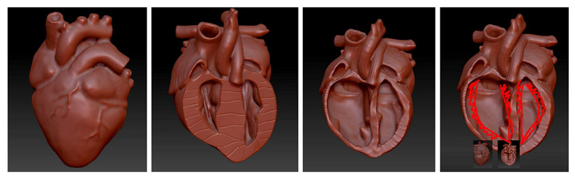 Банк 3D-моделей для СМК является уникальным за счет того, что в нем представлены органы с патологиями, которые могут быть как врожденными, так и приобретенными при различных заболеваниях. Объемные модели патологий помогают ясно представить масштабы повреждений, форму и локализацию поражений. Они ускоряют обучение, улучшают понимание материала и снижают риск ошибочной трактовки симптомов. Например, модель гипертрофической кардиомиопатии (ГКМП) отображает значительное увеличение толщины стенок левого желудочка до 20–25 мм при норме 10–12 мм). Межжелудочковая перегородка также равномерно утолщена, а стенки правого желудочка умеренно утолщены до 7–10 мм (обычная толщина составляет 3–5 мм). На рис. 5 представлена двойная обструкция в обоих желудочках сердца.