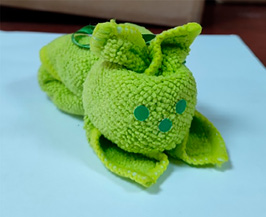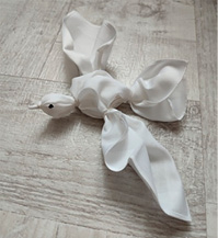 Далее изучались элементы декорирования тканей. Обучающиеся осваивали следующие техники: сборка вручную с помощью ручной стёжки и поперечных складок (гофре) и с использованием утюга, пришивание фалд, драпировка ткани для сложных декоративных элементов. Все эти приемы и способы позволяют освоить базовые техники работы с тканью и дают большие возможности для самовыражения, развития эстетического вкуса и дизайнерского мышления в процессе воплощения конкретного изделия или проекта. Первым практическим заданием для обучающихся было предложено создать образ животного или птицы из салфетки, или квадратного куска ткани с помощью сборок и складок. Примером выполнения данного задания служат работы обучающихся 5 класса Оксаны Ж. и Димы П. (рис. 2).