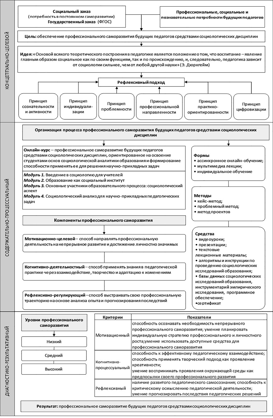 Разработанная модель профессионального саморазвития будущих педагогов средствами социологических дисциплин представляет собой комплексную систему, включающую три взаимосвязанных компонента: концептуально-целевой, содержательно-процессуальный, диагностико-результативный. Ее специфика заключается в том, что процесс обучения социологическим дисциплинам строится на совокупности теоретических положений профессионального саморазвития, опирается на данные анкетирования и реализуется в рамках рефлексивного подхода, основанного на принципах сознательности и активности, индивидуализации, проблемности, профессиональной направленности, практико-ориентированности и цифровизации. Это определяет выбор методов, форм и средств обучения, ориентированных на профессиональные задачи будущего педагога.