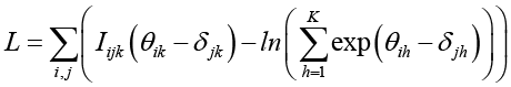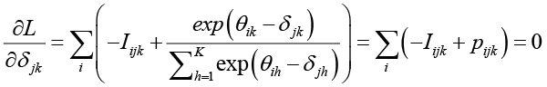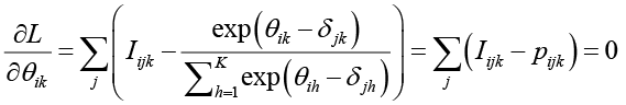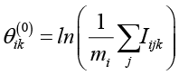 Для определения начальных значений используем выводы работы [19], в которой показано, что при применении байесовского подхода оценка xij = k приводит к увеличению exp(θik) на 1 и к увеличению exp(δjk) на 1 в противоположном случае. Прямое применение байесовского подхода затруднено, так как начальные значения латентных параметров неизвестны и определяются с точностью до некоторого смещения. Возможна ситуация, когда большое количество оценок одного обучающегося приведет к тому, что уровень его подготовленности будет существенно больше уровня подготовленности другого обучающегося с небольшим количеством оценок. Аналогичная ситуация характерна для трудностей оценок экзаменов. Для начальных значений латентных параметров такие неточности байесовского оценивания не играют существенной роли, поэтому положим
