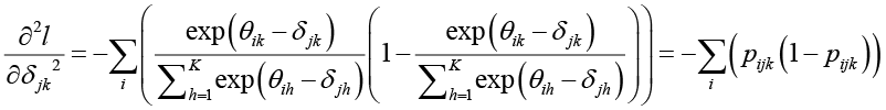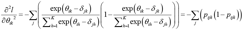 Неравенство Рао – Крамера позволяет найти нижние границы дисперсий полученных оценок латентных параметров. Для этого используется информационная матрица Фишера. Для предложенной модели характерно большое количество параметров. Для простоты предположим, что все параметры, кроме θik, известны и совпадают с решением уравнений (2) и (3). В этом случае количество информации Фишера для параметра подготовленности обучающегося