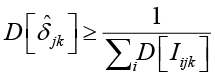 совпадает с суммой дисперсий индикаторов соответствующей оценки, так как вторая сумма математических ожиданий будет равна 0, поскольку индикаторы {Iijk } независимы в совокупности и математическое ожидание произведения будет равно произведению математических ожиданий, каждое из которых равно нулю. Для параметра трудности δjk количество информации будет равно сумме дисперсий индикаторов оценки k на j-м экзамене. Применяя неравенство Рао – Крамера, получаем неравенства
