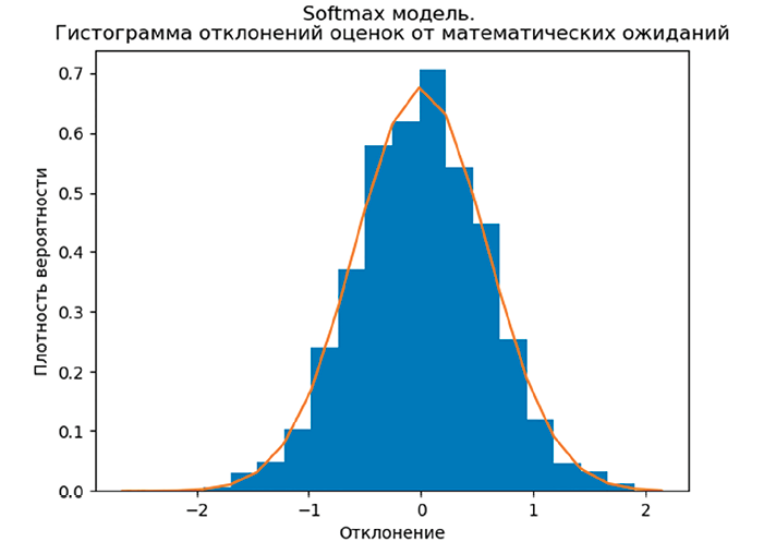 Для описания вероятностного распределения оценки, измеряемой в политомической шкале, предлагается использовать функцию Softmax [18]. Эта функция широко используется для описания распределений классов, определяемых нейронными сетями. Исходными данными являются наблюдения xij – оценки обучающихся, i – номер обучающегося, j – номер экзамена. Будем считать наблюдения реализациями случайных величин Xij, независимых в совокупности. Для описания соответствующих распределений вероятностей используем функцию Softmax