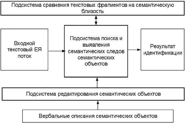 Подсистема поиска и выявления семантических следов отыскивает и распознает семантические следы, идентифицирует семантический объект. За установлением семантической близости характеристики и токена подсистема обращается к подсистеме сравнения текстовых фрагментов на семантическую близость.