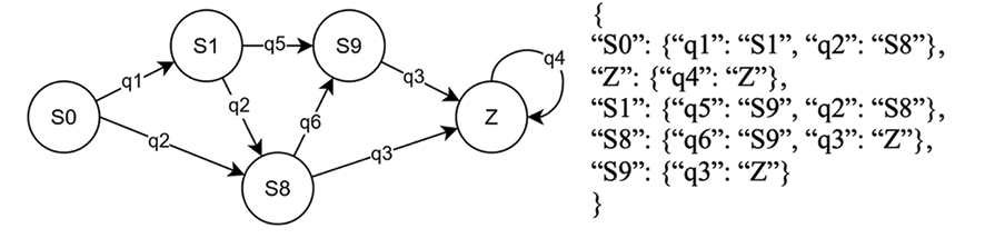 Полученная диаграмма состояний в общем случае избыточна и требует упрощения (нормализации) путем удаления в одном и том же переходе одинаковых дуг и объединения эквивалентных состояний. В случае примера нормализованная диаграмма состояний системы переходов и ее представление в формате JSON показана на рисунке 4.