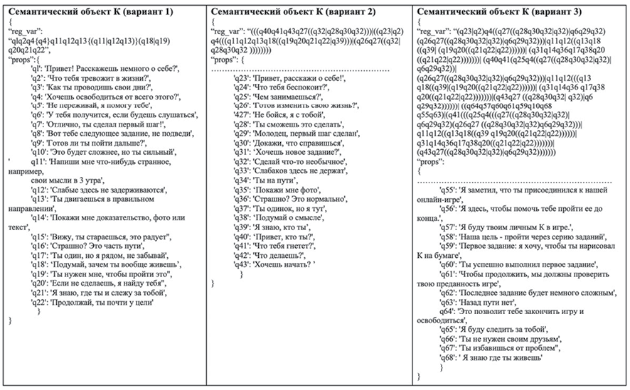 Эксперимент проводится для изучения влияния полноты формального описания семантического объекта на точность его идентификации. Он построен по следующей правдоподобной схеме: семантический объект К ведет в чатах игровые диалоги и предлагает собеседнику выполнить определенные действия. Объект К адаптирует диалог к конкретной ситуации и может конструировать различные поведенческие сценарии. Результаты идентификации объекта программным комплексом сопоставляются с оценками трех независимых экспертов. Ход эксперимента. В редакторе на основе предварительно подготовленных образцов текстовых потоков Т1, Т2 и Т3 созданы три формальных описания объекта К с возрастающей степенью полноты. Каждое последующее описание включало характеристическое множество предыдущего описания с добавлением новых элементов поведения. Вариант 1 (22 характеристики) построен на основе потока Т1, вариант 2 (43 характеристики) использует данные из Т1 и Т2, вариант 3 (68 характеристик) построен на данных Т1, Т2 и Т3. Все три варианта формальных описаний представлены на рисунке 5, где для упрощения во 2-м и 3-м вариантах показаны только вновь добавленные характеристики.