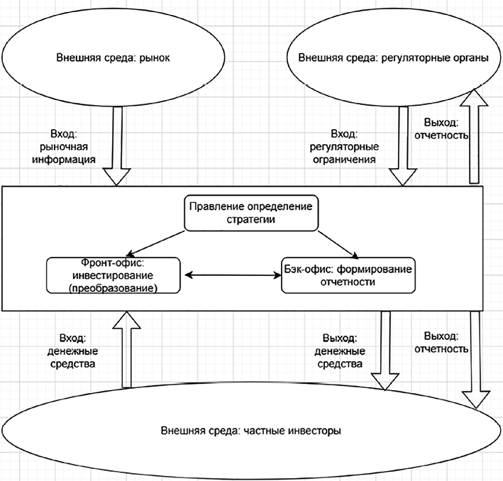 На входе организационная система институционального инвестора получает рыночную информацию и располагаемые денежные средства. Также на входе могут быть регуляторные ограничения. На выходе организационная система получает денежные средства. Денежные средства на выходе должны отличаться от денежных средств на входе в бо́льшую сторону. Приумноженные денежные средства являются основной составляющей результата деятельности институционального инвестора. Помимо этого, бэк-офис на выходе предоставляет отчетность. Преобразующим элементом в организационной системе коллективного инвестора выступает процесс инвестирования: преобразование денежных средств клиентов в финансовые активы, а затем обратное преобразование финансовых активов в денежные средства. Схема организационной системы института коллективного инвестирования представлена на рисунке.
