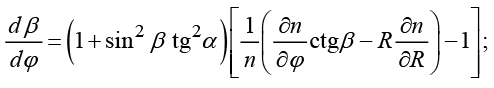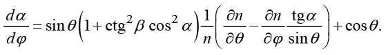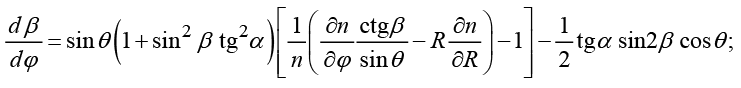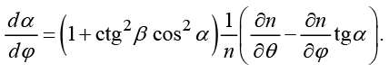 Вводя текущие углы рефракции α, β, из системы (6) получим лучевые дифференциальные уравнения в форме Лагранжа – Эйлера в сферической системе координат: