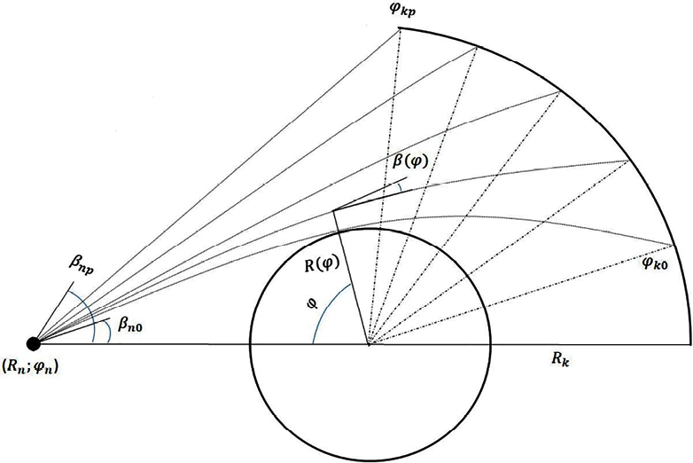 Рис. 1. Геометрия задачи. Вид сбоку. (Rn; φn) – координаты источника излучения относительно центра массивного объекта; Rk – расстояние до сферической поверхности; [φk0; φkp] – распределение конечных угловых координат лучей на сферической поверхности; [βn0; βnp] – диапазон начальных углов излучения; R(φ), φ, β(φ) – соответственно текущие значения радиальной и угловой координат луча, а также угла рефракции Источник: составлено авторами по результатам данного исследования