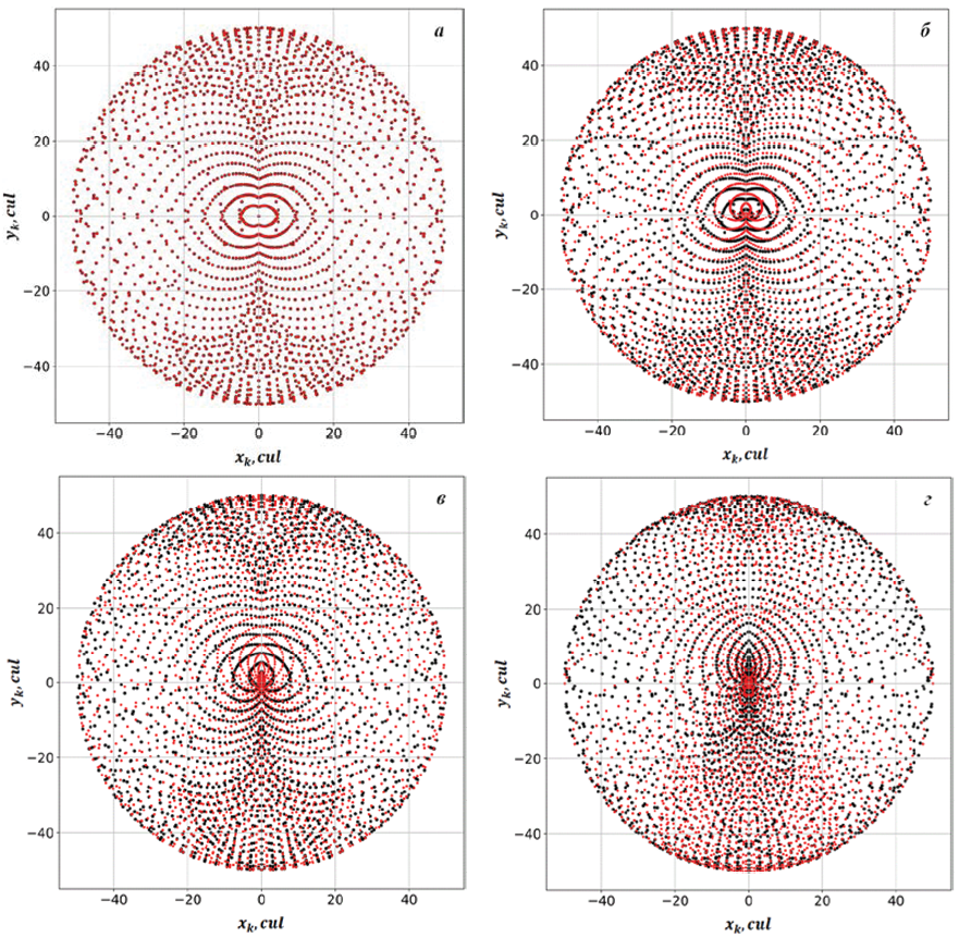 Результаты расчета представлены на рис. 2, где красными кружками обозначены проекции точек прихода лучей на фиксированное расстояние Rk, полученные посредством системы (7), а черными кружками – с применением системы (13).