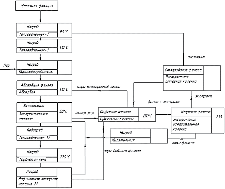 Технологическая схема описывает основные этапы производства с учетом требуемых температурных и временных параметров. Основными операциями процесса являются абсорбция, экстракция, нагрев, испарение. Сырьем является масляная фракция, после нагрева она подается в абсорбер, где под воздействием паров азеотропной смеси абсорбируются пары фенола. Затем сырье направляется в экстракционную колонну, где происходит капельно-жидкостное разделение на экстрактную и рафинатную фракции.