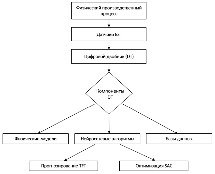 Для разработки практически применимого DT необходимо организовать сбор и обработку большого количества мультимодальной информации [10, 11], в том числе сигналов, поступающих от оборудования. От выбора метода и инструментов моделирования зависит точность представления физической системы. Математические, физические модели, построенные на основе уравнений, могут быть полезны в некоторых случаях, но за счет трудоемкости ручных вычислений снижают скорость принятия решений. Прогнозирование изменения параметров процесса и адаптация могут быть достигнуты при использовании комбинации IoT-устройств (многоточечных датчиков температуры, давления, спектрального ИК-диапазона для распознавания состава сырья), машинного обучения и применения нейросетевых моделей.