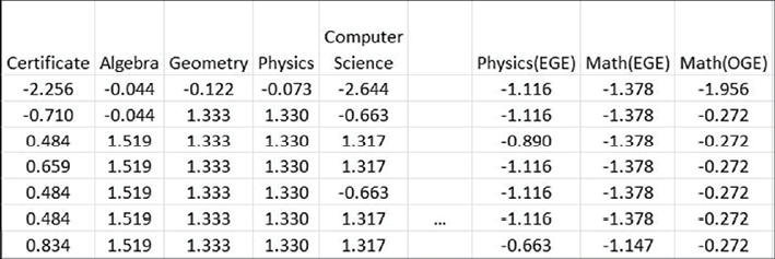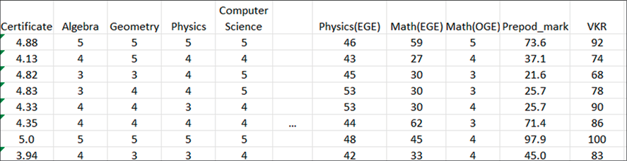 Данные распределены следующим образом. Входными данными являются оценки по школьным предметам, которые включают алгебру, геометрию, физику, информатику, русский язык, литературу, историю, биологию, химию, обществознание, географию, физическую культуру, иностранный язык, основы безопасности жизнедеятельности (ОБЖ), музыку, изобразительное искусство (ИЗО), технологию, средний балл за школьный аттестат по всем предметам, результаты ОГЭ по математике (все эти баллы в диапазоне оценок от 3 до 5). Также учитываются входные данные в виде результатов ЕГЭ по математике и по физике [6] (диапазон баллов от 40 до 100). Выходными данными являются оценки за ВКР и средняя экспертная оценка преподавателей (подробнее формирование оценки описано в статье [4]) с диапазоном баллов от 61 до 100. Фрагмент имеющихся данных изображен на рис. 1.