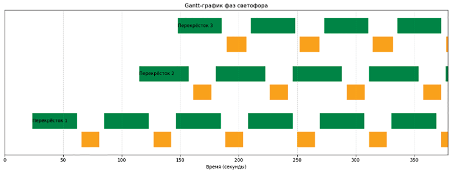 Особое внимание уделено проверке физической реализуемости решений. Алгоритм контролирует, чтобы сумма длительностей зеленых фаз и времени на переключения (8 с на цикл) не превышала длительности цикла. Также проверяется корректность значений offset, которые должны находиться в пределах от 0 до длительности цикла. Все эти проверки встроены непосредственно в процедуру генерации и оценки решений, что гарантирует получение только допустимых и безопасных вариантов регулирования [10–12].