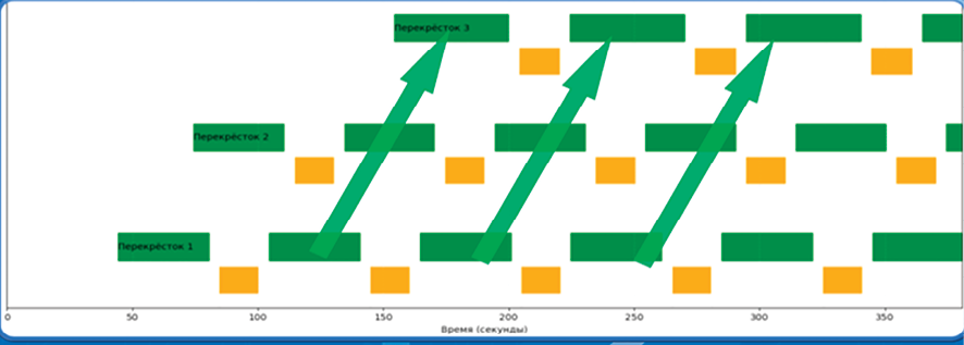 В ходе исследования была разработана математическая модель адаптивного управления светофорным регулированием на сети перекрестков [8, 9]. Каждый перекресток описывается четырьмя ключевыми параметрами: длительностью полного цикла, продолжительностью зеленых фаз по главному и второстепенному направлениям, а также временным смещением (offset) относительно общего времени. Для сети из трех перекрестков решение кодируется 12 параметрами, формируя компактное и удобное для обработки представление.