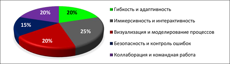 На рисунке представлена круговая диаграмма, иллюстрирующая основные аспекты педагогического потенциала виртуальной реальности в процессе формирования компетентности в области тестирования информационных систем. Наибольший вклад вносит компонент интерактивности (25%) благодаря способности виртуальной реальности создавать эффект погружения и стимулировать активное участие студентов. Значительную роль играют гибкость и адаптивность (20%), визуализация процессов (20%) и командное взаимодействие (20%), которые поддерживают разнообразие сценариев и развитие профессиональных навыков. Безопасность и контроль ошибок (15%) дополняют картину, позволяя студентам проводить эксперименты в тестировании на кроссплатформенность без риска и совершенствовать свои действия, оттачивая навыки компетенции тестировщика. Диаграмма демонстрирует, что комплексное сочетание указанных компонентов делает VR эффективным инструментом формирования профессиональных ИТ-компетенций.