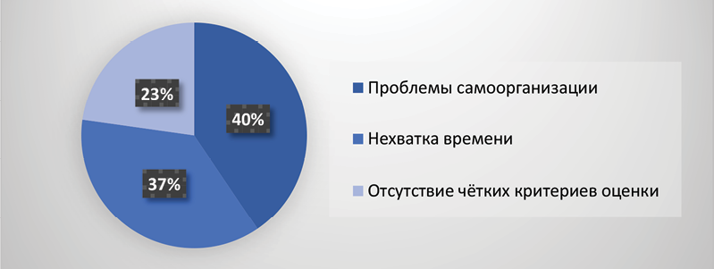 Анализ анкетирования 258 студентов показал, что самостоятельную работу при изучении иностранного языка воспринимают как важную часть своей профессиональной подготовки лишь около 30% опрошенных. Уровень внутренней мотивации к регулярному выполнению внеаудиторных заданий в целом остаётся низким: только 16% студентов сообщили о стабильно высокой мотивации, остальные указали на колебания интереса и сложности с самоорганизацией в зависимости от учебной нагрузки. Среди причин, затрудняющих систематическую работу, респонденты наиболее часто отмечали однообразие заданий, отсутствие своевременной обратной связи и чётких критериев оценки результатов, что созвучно выводам других исследований [4-6]. Рисунок 1 представляет обобщённые данные по наиболее распространённым трудностям самостоятельной работы. Для значительной части студентов проблемой стала организация времени и планирование учебной деятельности (40%), также значительное число опрошенных назвали главным препятствием нехватку времени (37%), и ещё 23% указали на сложности с распределением нагрузки, особенно в периоды сессий и промежуточного контроля.