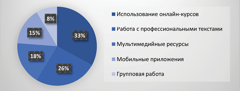 Рисунок 2 представляет обобщенные данные по предпочтительным формам самостоятельной работы. Значительная доля студентов (33%) считает наиболее эффективными онлайн-курсы и платформы с интерактивными заданиями, 26% предпочитают самостоятельную работу с профессиональными текстами, а 18% отмечают пользу мультимедийных ресурсов для аудирования и устной практики. 15% респондентов регулярно используют мобильные приложения для тренировки лексики, и около 8% студентов отдают предпочтение групповой самостоятельной работе по согласованию с преподавателем. Эти результаты отражают современные тенденции цифрового образования, в котором особое внимание уделяется индивидуализации учебного процесса [7–9].