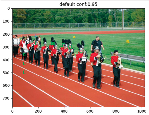 Необходимо было распознать пять малых «смазанных» объектов – лиц марширующих музыкантов. Базовая модель CNN-сети правильно распознала четыре из них, еще два лица отнесла к малым объектам, хотя их размеры превышают метрику COCO, а также «увидела» три объекта, не относящихся к лицам (рис. 2). Модель LtnDetector даже с весом λ = 0,25 правильно обнаружила все пять мелких объектов.