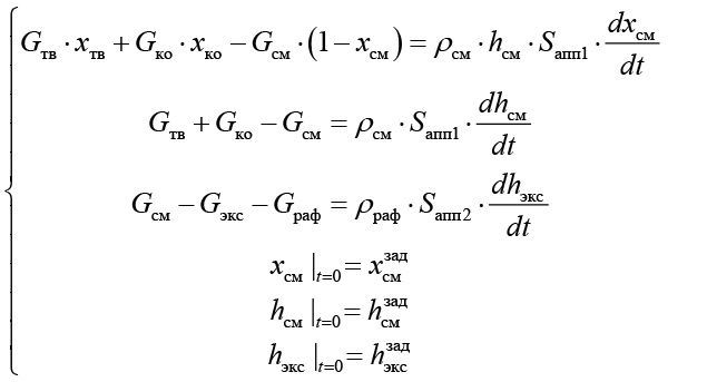 где Gтв – объемный расход технологической воды, м3/ч; Gко – объемный расход кубового остатка, м3/ч; Gсм – объемный расход смеси, м3/ч; хтв – концентрация технологической воды; хко – концентрация кубового остатка; хсм – концентрация кубовых остатков в смеси; ρсм – плотность смеси, кг/м3; hсм – уровень смеси, м; Sапп1 – площадь поперечного сечения смесителя, м2; Gэкс – объемный расход экстракта, м3/ч; Gраф – объемный расход рафината, м3/ч; ρраф – плотность рафината, кг/м3; Sапп2 – площадь поперечного сечения сепаратора, м2; hэкс – уровень экстракта в сепараторе, м.