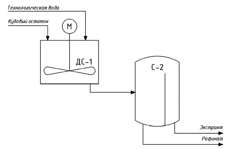 Узел водной экстракции (рис. 1), предназначенный для выделения ценных компонентов из кубового остатка, таких как гидрохинон и акриловая кислота, включает динамический смеситель поз. ДС-1 и сепаратор с разделительной стенкой поз. С-2.