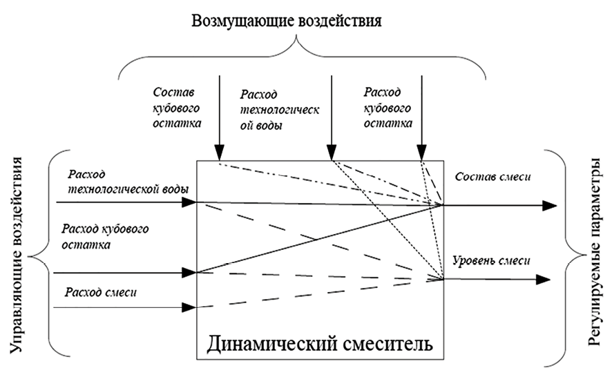 Рассматриваемый объект является многомерным, требующим компенсации возмущающих воздействий [12]. Расход смеси и ее состав на выходе из динамического смесителя определяются расходами технологической воды и кубового остатка, а также концентрацией кубового остатка на входе в аппарат.