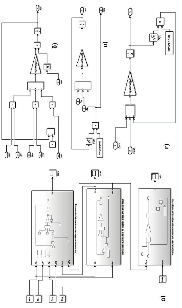 Рис. 3. Блок-схема модели объекта управления в системе Simulink: а – общий вид блок-схемы, б – блок-схема математического описания материального баланса по целевому компоненту, в – блок-схема математического описания материального баланса по жидкой фазе для смесителя, г – блок-схема математического описания материального баланса по жидкой фазе для сепаратора Источник: составлено авторами