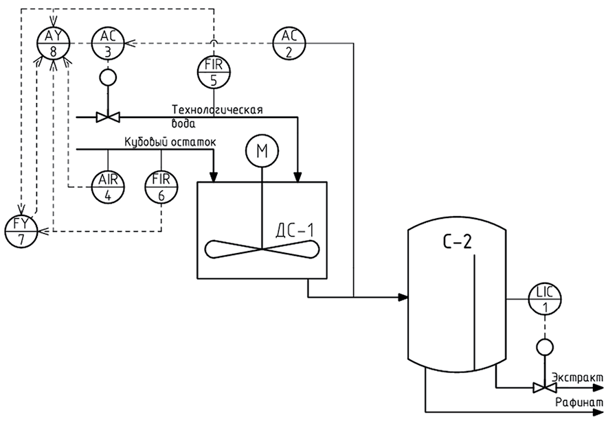 Рассматриваемый производственный процесс представляет собой сложную систему и сопряжен с необходимостью повышения качества экстракции ценных компонентов из кубового остатка, обеспечением безопасности и надежности производства. Решение данных проблем возможно за счет разработки оптимальной системы автоматического управления смесительно-отстойной экстракционной установкой, позволяющей осуществлять компенсацию влияния возмущающих воздействий. Так, в патенте Захидова Б.А., Мусаева Ф.С. представлена комбинированная система управления процессом экстракции в производстве фосфорной кислоты. Цель изобретения заключается в уменьшении потерь экстракционной фосфорной кислоты путем применения каскадного регулирования, что позволит повысить точность регулирования, эффективность процесса экстракции и уменьшить потери фосфорной кислоты на выходе [1]. В работе Олейниковой А.Ф., Ушатинской Н.П. представлено изобретение, целью которого является стабилизация качества получаемых продуктов и увеличение степени их извлечения. Достижение цели обеспечивается за счет того, что устройство дополнительно оснащено цепью коррекции по величине превышения нормы потерь целевого продукта совместно с побочным [2]. С учетом предложений по реализации управления экстракционными установками, представленных в патентах [3; 4], анализа существующих решений по автоматизации процесса экстракции выявлена необходимость принимать во внимание изменения компонентного состава и расхода исходного раствора, подаваемого в установку. В проанализированных источниках по теме исследования предлагается реализовать комбинированные системы управления, компенсирующие различные возмущающие воздействия и тем самым позволяющие повысить качество регулирования.