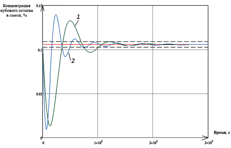 Выполнен расчет показателей качества процесса управления [14; 15] для системы регулирования концентрации кубового остатка в смеси на выходе из динамического смесителя с принципом управления по отклонению и системы с реализацией комбинированного управления (таблица). Графики переходных процессов для рассматриваемых систем представлены на рисунке 5.