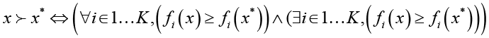 Выражение x ≻ x* означает, что x доминирует над x*: x доминирует над x* по Парето в том случае, если x не хуже x* по всем критериям и хотя бы по одному критерию превосходит x*. В таком случае в выборе x* нет смысла, так как x не только не уступает x*, но и доминирует в некоторых случаях. Если рассматривать область пространства, доминируемую решением A на примере двухкритериальной оптимизационной задачи (оба критерия максимизируются), то эта область является замкнутой, а элементы на границы решения также являются доминируемыми решением A (рис. 1).