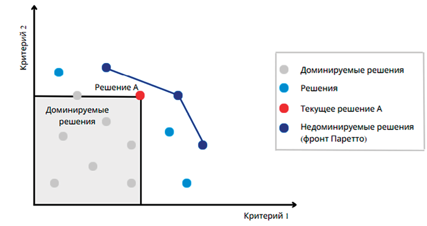 Задача многокритериальной оптимизации предполагает множество решений, относящихся к паретовским решениям [8]. Лицо, принимающее решение (ЛПР), получает на основе математических расчетов совокупность компромиссных решений. Точки, входящие в решение, должны быть недоминируемые (неулучшаемые) [9].