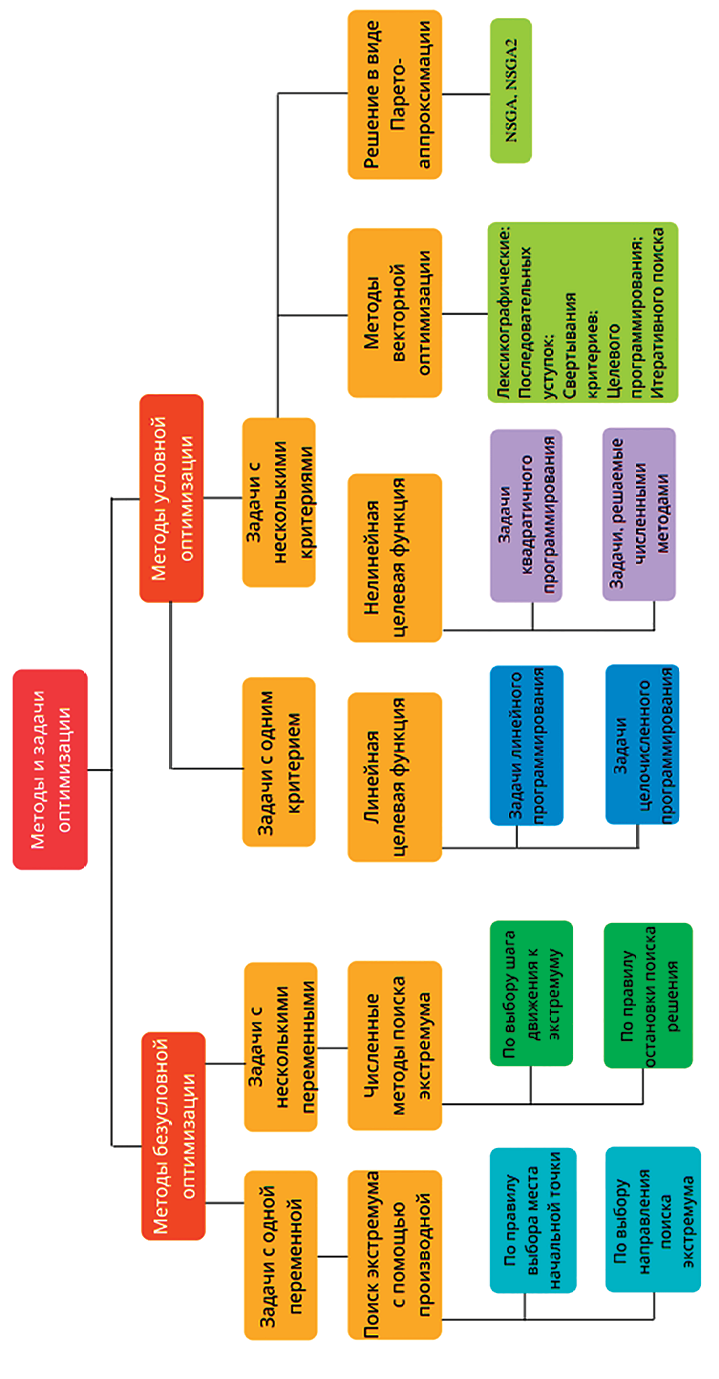 Задачи многокритериальной оптимизации различаются по типу целевой функции (задачи линейного, нелинейного, квадратичного программирования), количества оптимизируемых критериев (однокритериальные и многокритериальные) и условий (условные и безусловные). От вида оптимизационной задачи зависит выбор метода решения. На рис. 2 представлена классификация методов решения оптимизационных задач [10, 11].