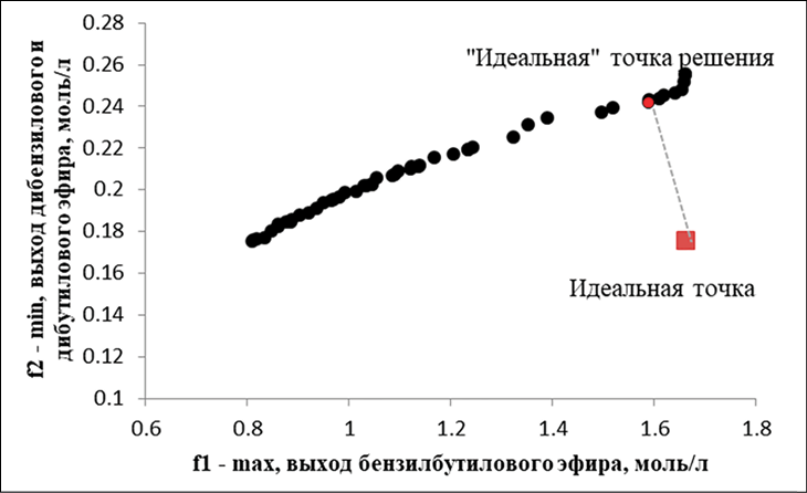 Рис. 3. Аппроксимация фронта Парето МКО-задачи реакции синтеза бензилбутилового эфира в присутствии металлокомплексного катализатора. Выбор «идеальной» точки решения Примечание: составлен авторами по результатам данного исследования