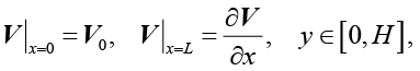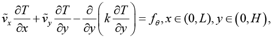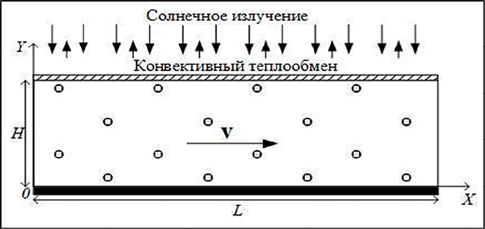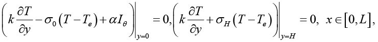 где ṽx = cvv, ṽy = cvu; Iθ и fθ задаются выражениями, представленными в работе [11]; Te – температура окружающей среды; σ0, σH – коэффициенты теплоотдачи на нижней и на верхней границах коллектора соответственно.