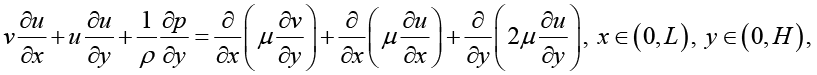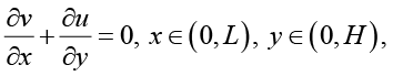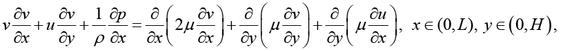 Рассмотрим задачу определения скорости V = (v,u) рабочей жидкости в тонком коллекторе. Считаем, что движение жидкости в коллекторе установилось, скорость течения не зависит от времени. Для построения математической модели используем стационарное уравнение Навье – Стокса и уравнение несжимаемости, которые запишем в двумерной покомпонентной форме для составляющих вектора скорости в декартовой системе координат x, y.