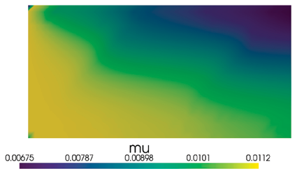 3) расчет поля скоростей путем решения системы уравнений (8)–(10), (13)–(15) с учетом полученного распределения динамической вязкости;