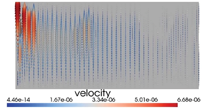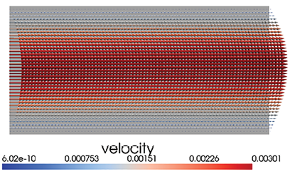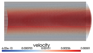 2. Распределение поля скорости (рис. 3) демонстрирует явную связь с температурным полем, обусловленную зависимостью вязкости от температуры. Это свидетельствует о том, что термореологическое взаимодействие играет ключевую роль в формировании гидродинамической структуры потока даже при отсутствии плавучести.